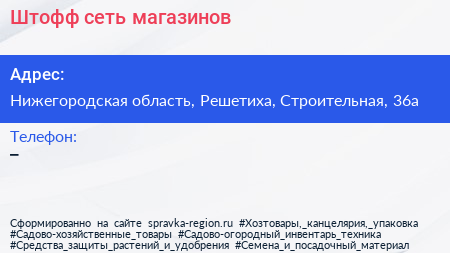 Штофф, сеть магазинов по адресу Нижегородская область, Решетиха, Строительная, 36а в дальнейшем Организация, размещена в следующих категориях: