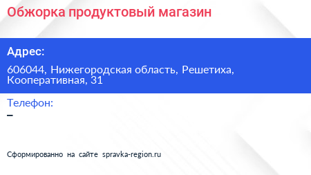 Обжорка, продуктовый магазин по адресу 606044, Нижегородская область, Решетиха, Кооперативная, 31 в дальнейшем Организация, размещена в следующих категориях:
