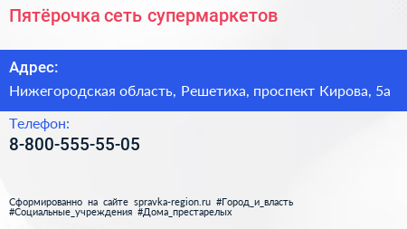 Пятёрочка, сеть супермаркетов по адресу Нижегородская область, Решетиха, проспект Кирова, 5а в дальнейшем Организация, размещена в следующих категориях: