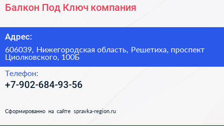 Балкон Под Ключ, компания по адресу 606039, Нижегородская область, Решетиха, проспект Циолковского, 100Б в дальнейшем Организация, размещена в следующих категориях: