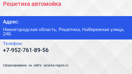 Решетиха, автомойка по адресу Нижегородская область, Решетиха, Набережная улица, 24Б в дальнейшем Организация, размещена в следующих категориях: