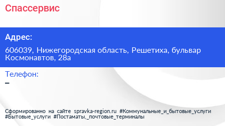 Спассервис по адресу 606039, Нижегородская область, Решетиха, бульвар Космонавтов, 28а в дальнейшем Организация, размещена в следующих категориях: