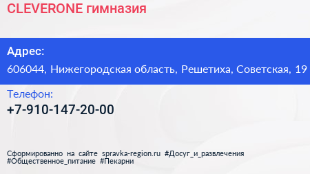 CLEVERONE, гимназия по адресу 606044, Нижегородская область, Решетиха, Советская, 19 в дальнейшем Организация, размещена в следующих категориях: