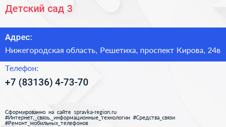 Детский сад №3 по адресу Нижегородская область, Решетиха, проспект Кирова, 24в в дальнейшем Организация, размещена в следующих категориях: