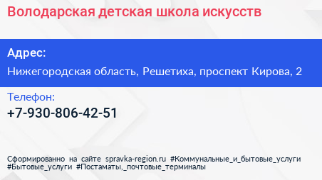 Володарская детская школа искусств по адресу Нижегородская область, Решетиха, проспект Кирова, 2 в дальнейшем Организация, размещена в следующих категориях: