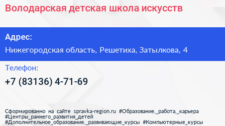 Володарская детская школа искусств по адресу Нижегородская область, Решетиха, Затылкова, 4 в дальнейшем Организация, размещена в следующих категориях: