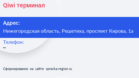 Qiwi, терминал по адресу Нижегородская область, Решетиха, проспект Кирова, 1а в дальнейшем Организация, размещена в следующих категориях: