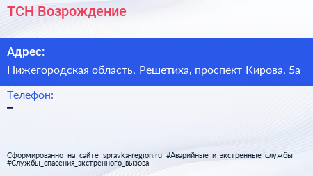 ТСН Возрождение по адресу Нижегородская область, Решетиха, проспект Кирова, 5а в дальнейшем Организация, размещена в следующих категориях: