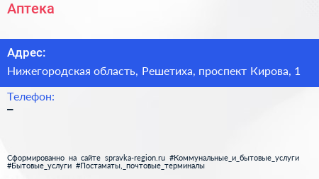 Аптека по адресу Нижегородская область, Решетиха, проспект Кирова, 1 в дальнейшем Организация, размещена в следующих категориях: