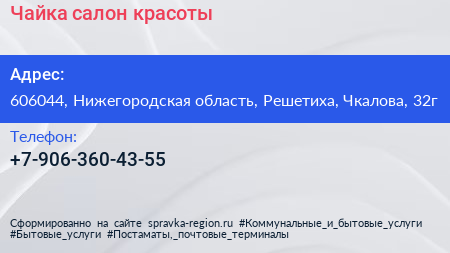 Чайка, салон красоты по адресу 606044, Нижегородская область, Решетиха, Чкалова, 32г в дальнейшем Организация, размещена в следующих категориях: