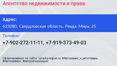 Агентство недвижимости и права по адресу 623280, Свердловская область, Ревда, Мира, 25 в дальнейшем Организация, размещена в следующих категориях: