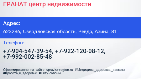 ГРАНАТ, центр недвижимости по адресу 623286, Свердловская область, Ревда, Азина, 81 в дальнейшем Организация, размещена в следующих категориях: