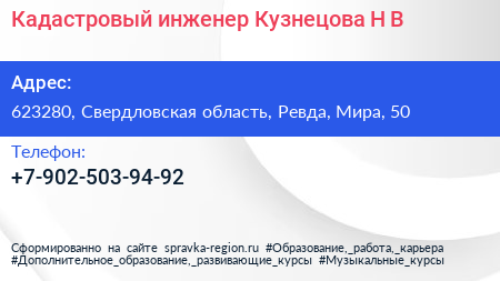 Кадастровый инженер Кузнецова Н.В. по адресу 623280, Свердловская область, Ревда, Мира, 50 в дальнейшем Организация, размещена в следующих категориях: