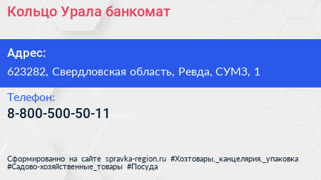 Кольцо Урала, банкомат по адресу 623282, Свердловская область, Ревда, СУМЗ, 1 в дальнейшем Организация, размещена в следующих категориях: