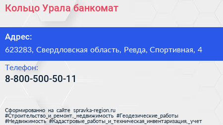 Кольцо Урала, банкомат по адресу 623283, Свердловская область, Ревда, Спортивная, 4 в дальнейшем Организация, размещена в следующих категориях: