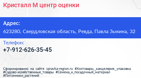 Кристалл-М, центр оценки по адресу 623280, Свердловская область, Ревда, Павла Зыкина, 32 в дальнейшем Организация, размещена в следующих категориях: