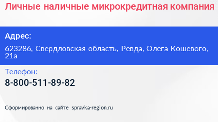 Личные наличные, микрокредитная компания по адресу 623286, Свердловская область, Ревда, Олега Кошевого, 21а в дальнейшем Организация, размещена в следующих категориях: