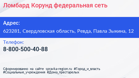 Ломбард Корунд, федеральная сеть по адресу 623281, Свердловская область, Ревда, Павла Зыкина, 12 в дальнейшем Организация, размещена в следующих категориях: