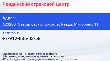 Ревдинский, страховой центр по адресу 623280, Свердловская область, Ревда, Мичурина, 11 в дальнейшем Организация, размещена в следующих категориях: