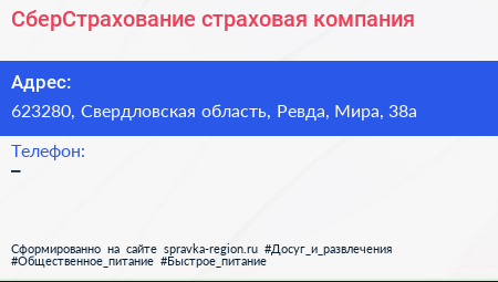 СберСтрахование, страховая компания по адресу 623280, Свердловская область, Ревда, Мира, 38а в дальнейшем Организация, размещена в следующих категориях:
