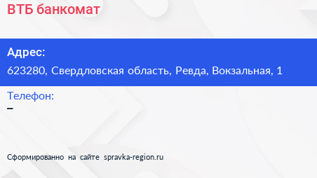 ВТБ, банкомат по адресу 623280, Свердловская область, Ревда, Вокзальная, 1 в дальнейшем Организация, размещена в следующих категориях: