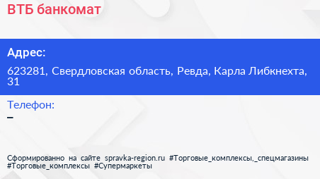 ВТБ, банкомат по адресу 623281, Свердловская область, Ревда, Карла Либкнехта, 31 в дальнейшем Организация, размещена в следующих категориях: