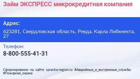 Займ ЭКСПРЕСС, микрокредитная компания по адресу 623281, Свердловская область, Ревда, Карла Либкнехта, 27 в дальнейшем Организация, размещена в следующих категориях: