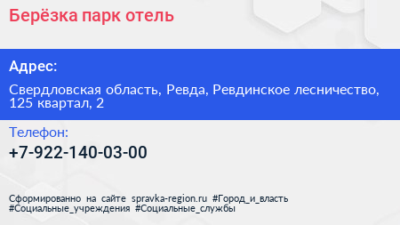 Берёзка, парк-отель по адресу Свердловская область, Ревда, Ревдинское лесничество, 125 квартал, 2 в дальнейшем Организация, размещена в следующих категориях: