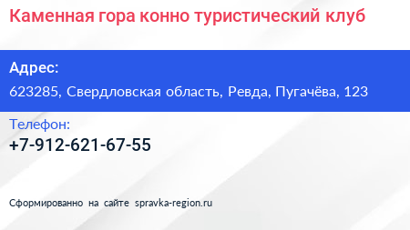 Каменная гора, конно-туристический клуб по адресу 623285, Свердловская область, Ревда, Пугачёва, 123 в дальнейшем Организация, размещена в следующих категориях: