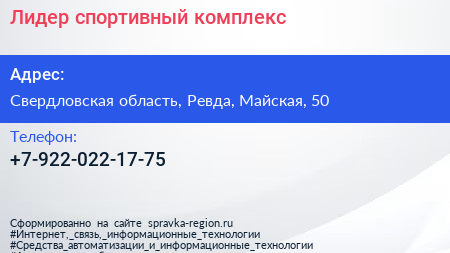Лидер, спортивный комплекс по адресу Свердловская область, Ревда, Майская, 50 в дальнейшем Организация, размещена в следующих категориях: