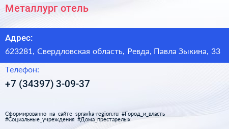 Металлург, отель по адресу 623281, Свердловская область, Ревда, Павла Зыкина, 33 в дальнейшем Организация, размещена в следующих категориях: