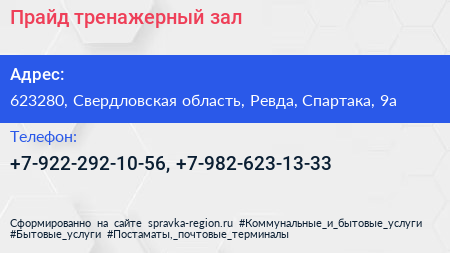 Прайд, тренажерный зал по адресу 623280, Свердловская область, Ревда, Спартака, 9а в дальнейшем Организация, размещена в следующих категориях: