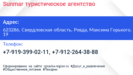 Sunmar, туристическое агентство по адресу 623286, Свердловская область, Ревда, Максима Горького, 19 в дальнейшем Организация, размещена в следующих категориях: