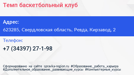 Темп, баскетбольный клуб по адресу 623285, Свердловская область, Ревда, Кирзавод, 2 в дальнейшем Организация, размещена в следующих категориях: