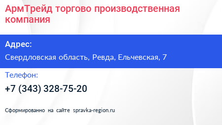 АрмТрейд, торгово-производственная компания по адресу Свердловская область, Ревда, Ельчевская, 7 в дальнейшем Организация, размещена в следующих категориях: