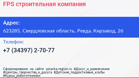 FPS, строительная компания по адресу 623285, Свердловская область, Ревда, Кирзавод, 26 в дальнейшем Организация, размещена в следующих категориях: