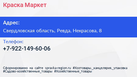 Краска Маркет по адресу Свердловская область, Ревда, Некрасова, 8 в дальнейшем Организация, размещена в следующих категориях: