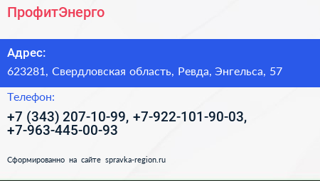 ПрофитЭнерго по адресу 623281, Свердловская область, Ревда, Энгельса, 57 в дальнейшем Организация, размещена в следующих категориях:
