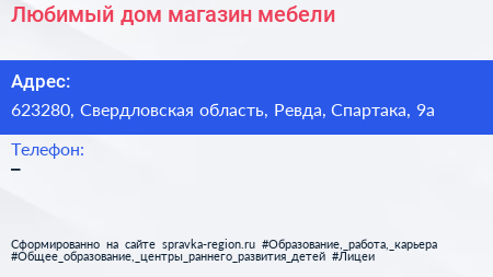 Любимый дом, магазин мебели по адресу 623280, Свердловская область, Ревда, Спартака, 9а в дальнейшем Организация, размещена в следующих категориях:
