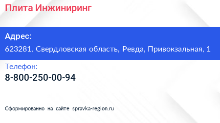 Плита Инжиниринг по адресу 623281, Свердловская область, Ревда, Привокзальная, 1 в дальнейшем Организация, размещена в следующих категориях: