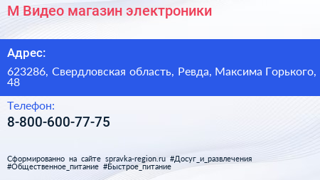 M.Видео, магазин электроники по адресу 623286, Свердловская область, Ревда, Максима Горького, 48 в дальнейшем Организация, размещена в следующих категориях: