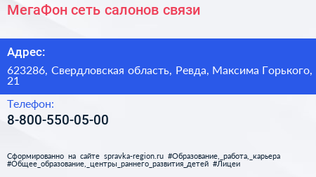 МегаФон, сеть салонов связи по адресу 623286, Свердловская область, Ревда, Максима Горького, 21 в дальнейшем Организация, размещена в следующих категориях: