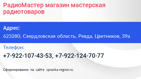 РадиоМастер, магазин-мастерская радиотоваров по адресу 623280, Свердловская область, Ревда, Цветников, 39а в дальнейшем Организация, размещена в следующих категориях: