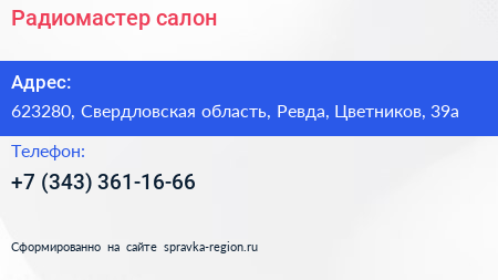 Радиомастер, салон по адресу 623280, Свердловская область, Ревда, Цветников, 39а в дальнейшем Организация, размещена в следующих категориях: