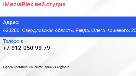 iMediaPlex, веб-студия по адресу 623286, Свердловская область, Ревда, Олега Кошевого, 25 в дальнейшем Организация, размещена в следующих категориях: