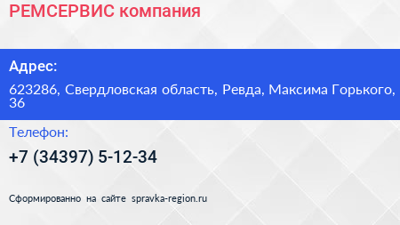 РЕМСЕРВИС, компания по адресу 623286, Свердловская область, Ревда, Максима Горького, 36 в дальнейшем Организация, размещена в следующих категориях: