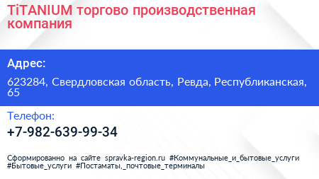 TiTANIUM, торгово-производственная компания по адресу 623284, Свердловская область, Ревда, Республиканская, 65 в дальнейшем Организация, размещена в следующих категориях: