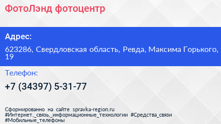 ФотоЛэнд, фотоцентр по адресу 623286, Свердловская область, Ревда, Максима Горького, 19 в дальнейшем Организация, размещена в следующих категориях: