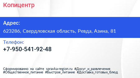 Копицентр по адресу 623286, Свердловская область, Ревда, Азина, 81 в дальнейшем Организация, размещена в следующих категориях: