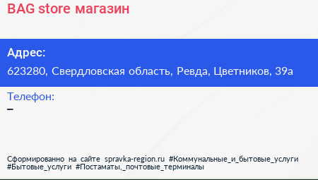 BAG store, магазин по адресу 623280, Свердловская область, Ревда, Цветников, 39а в дальнейшем Организация, размещена в следующих категориях: